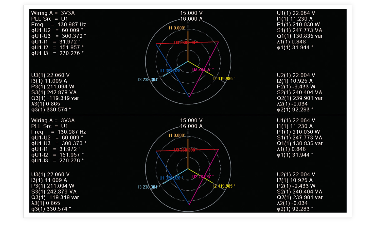 PA6000H功率分析儀可同時測量并顯示變頻器輸入三相與輸出三相的矢量圖,可對輸入、輸出各相間的相角關系進行分析,準確評估出輸入信號對輸出信號的角差影響。