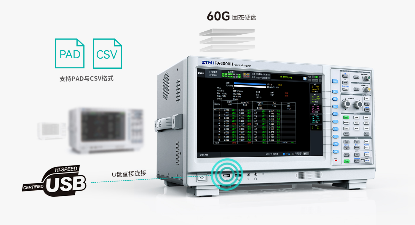 PA6000H功率分析儀擁有高達240G的固態硬盤可以海量存儲數據,用戶更可以直接連接U盤將想要的數據全部儲存,PAD與CSV格式多樣支持、存儲時間隨意控制,讓存儲再也不是難題。