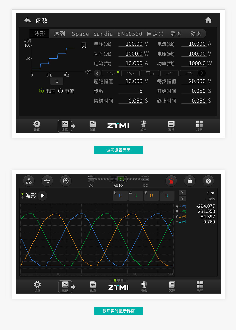 PSD8000 將“效率為先”融入產(chǎn)品設(shè)計(jì)。設(shè)備波形庫內(nèi)置豐富的常用測(cè)試波形,用戶可以通過拖動(dòng)的方式快速將各類波形進(jìn)行序列編程,界面下方會(huì)直觀的展示序列變化;點(diǎn)擊輸出后,界面將自動(dòng)切換為波形實(shí)時(shí)顯示界面, 可以顯示 U、I、P、R 等參數(shù)。如此可將波形設(shè)置及波形顯示深度串聯(lián),令測(cè)試更加流程化。