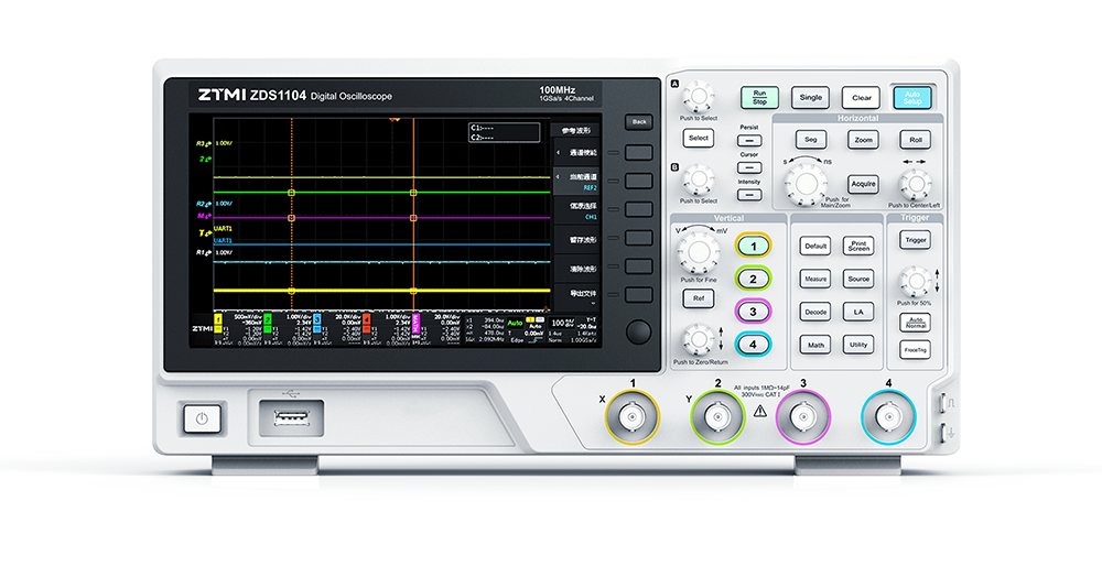 不同于傳統示波器只測一個周期,或通過抽樣減少數據量再測量的模式,ZDS1104示波器通過FPGA全硬件并行處理,基于原始采樣率和28Mpts全存儲深度,對每一幀波形每一周期進行測量統計,測試項目可達50余種,并且支持8種參數同時顯示。