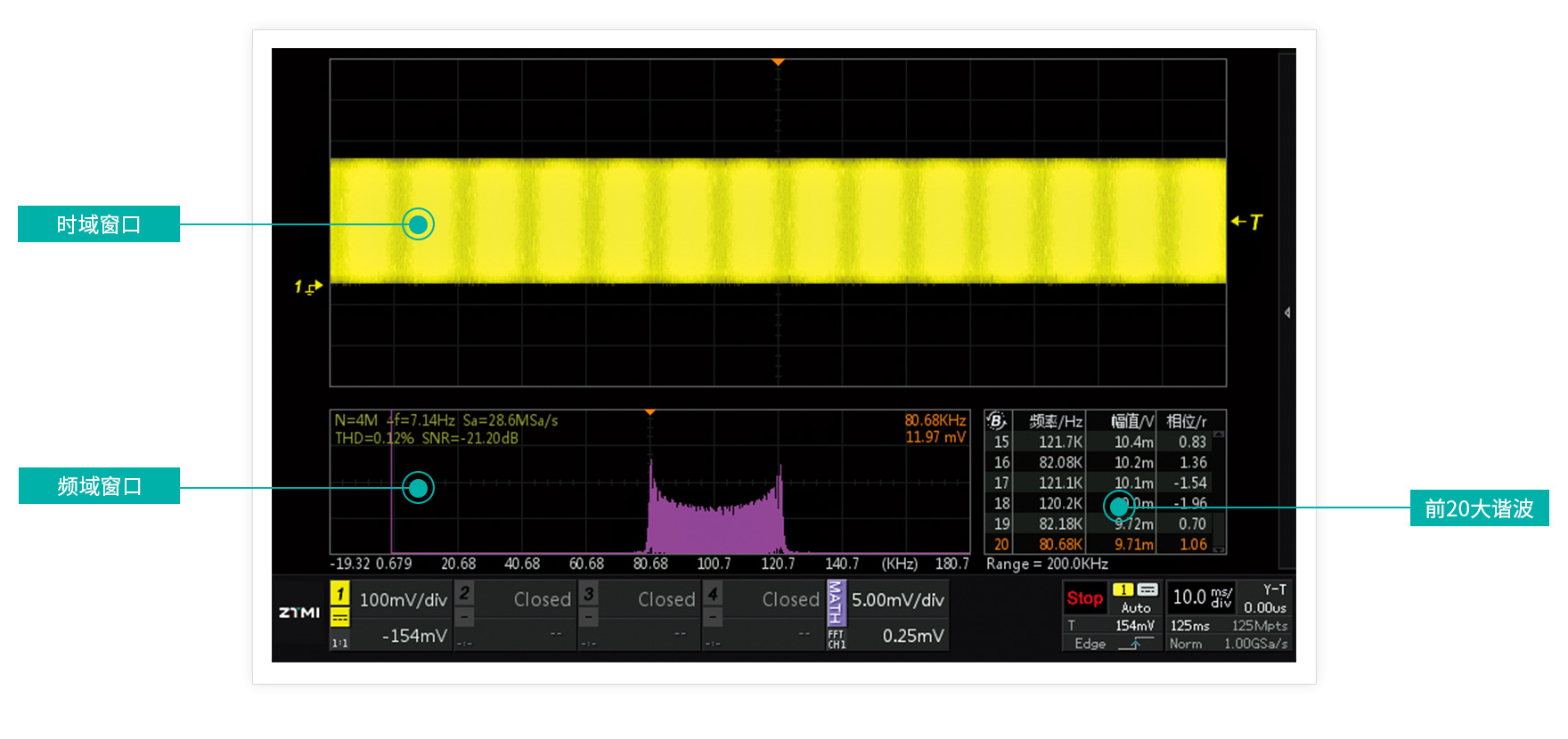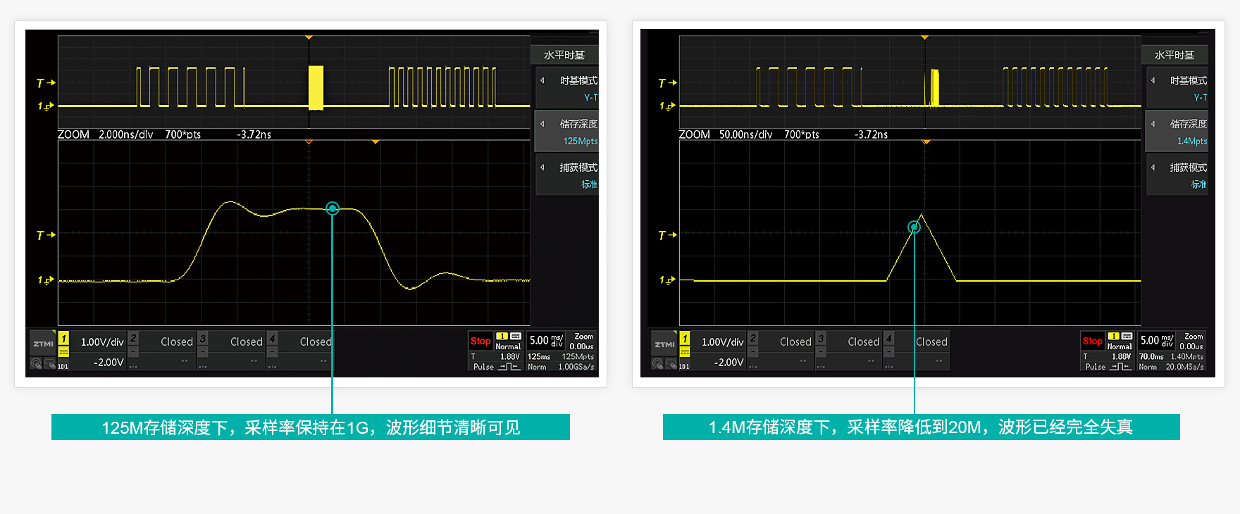 125Mpts存儲深度,捕獲長時間波形不失真