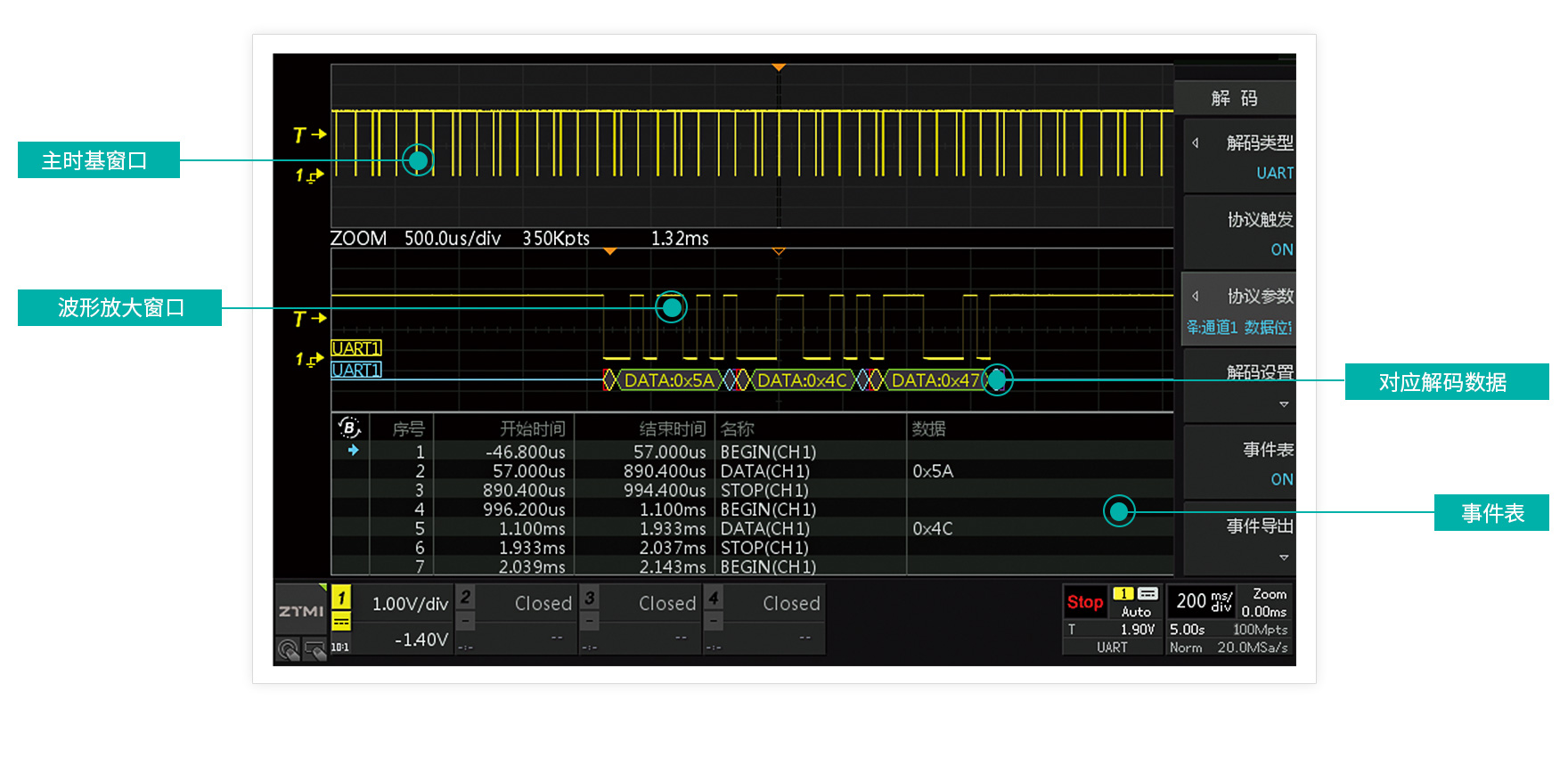 ZDS2024C 支持邊沿、脈寬、上升 / 下降時間等多種觸發搜索條件,全硬件加速,2 秒就能從海量波形里精準找到目標。同時自帶手動 + 自動兩種波形標注,標完會顯示白色三角標記,方便你快速定位、回看、分析波形。