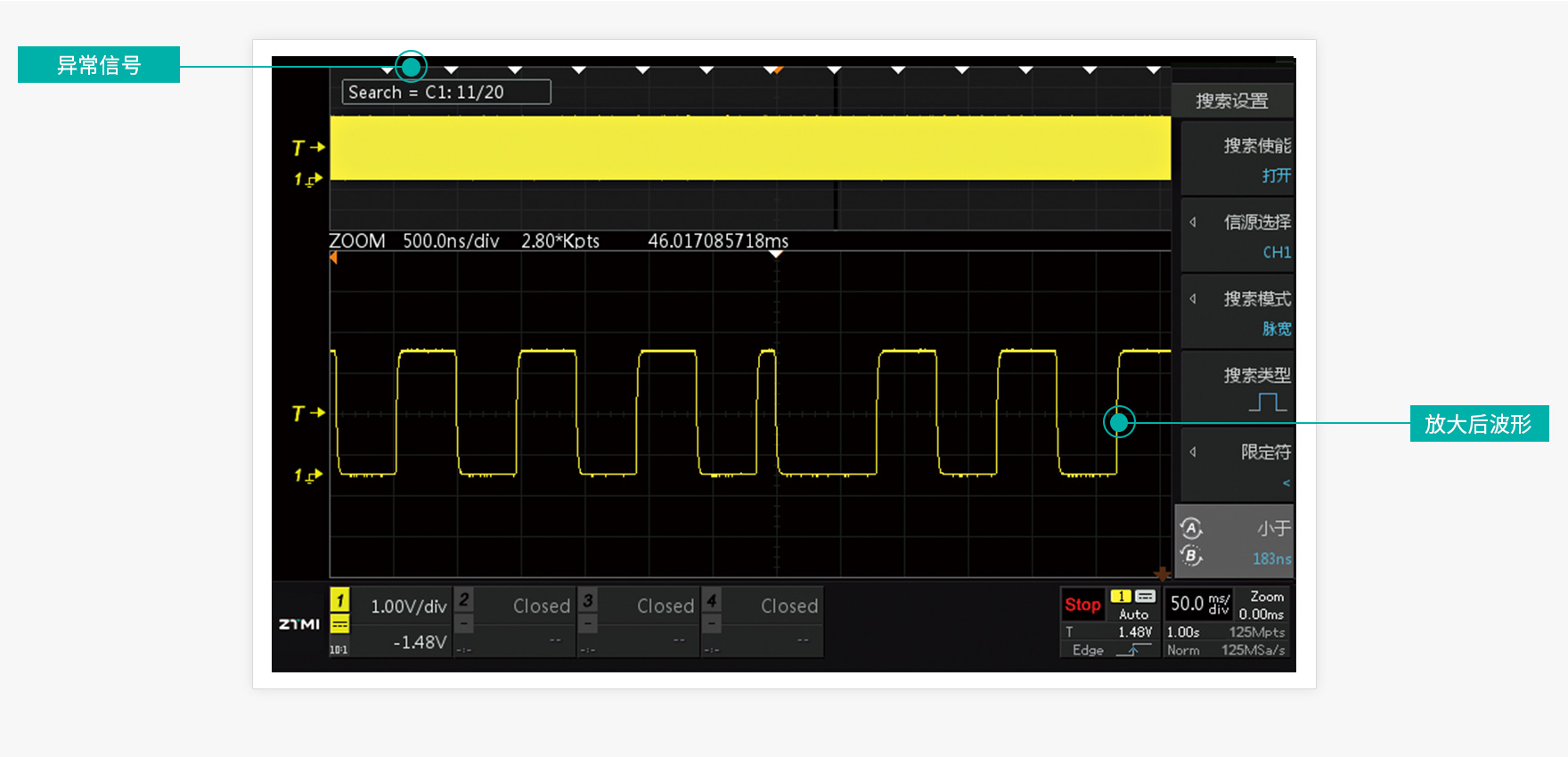 如果存儲深度不足,高采樣率的情況下只能捕獲一小段波形,ZDS2024C標配125Mpts存儲深度,保持1GSa/s采樣率的情況下,依然可以捕獲125ms波形。