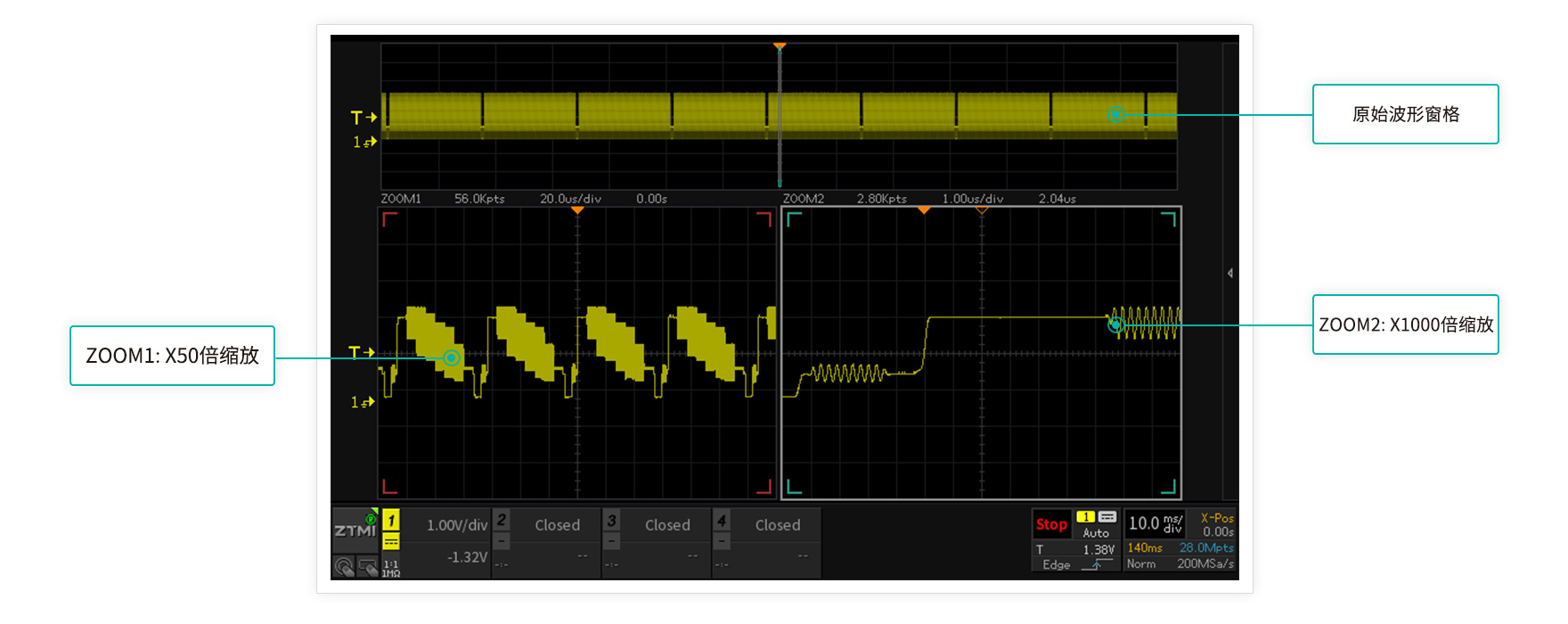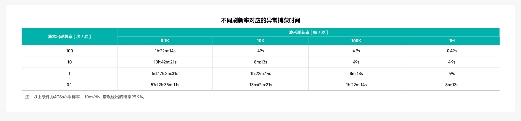 波形刷新率越高,死區(qū)時間就越短。ZDS4000系列示波器,標配1M次波形刷新率,配合模板觸發(fā),讓您最大概率的發(fā)現(xiàn)并捕獲異常信號。