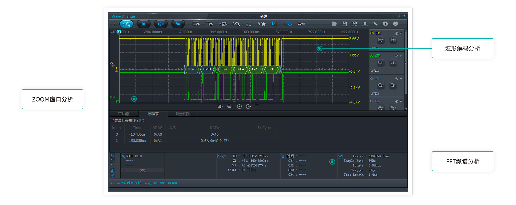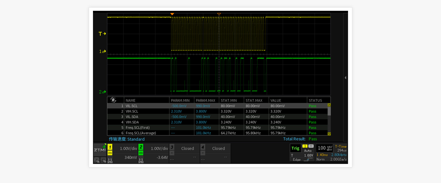 ZDS4000系列示波器免費標配時序分析功能,支持自定義參數(shù)配置對I2C、I2S、SPI、MIPI-RFFE、CAN、Reset、Switch進行分析處理。自動分析多個波形中最差情況是否滿足標準,可直接篩選某個特定節(jié)點并直接生成附帶截圖的報告。
