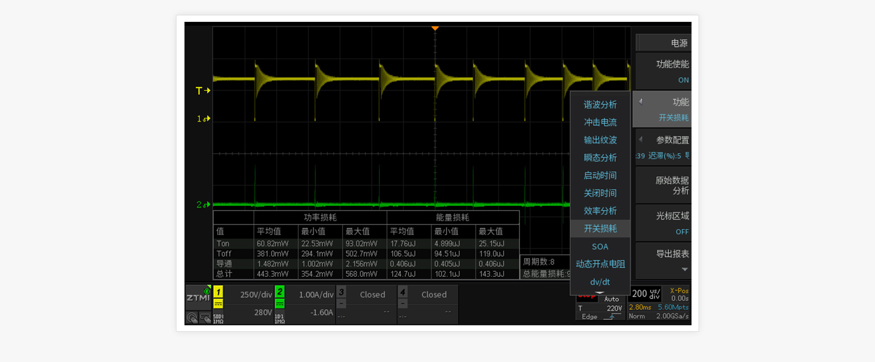 開關(guān)電源的質(zhì)量直接影響到產(chǎn)品的技術(shù)性能以及其安全性和可靠性。電源測試項目多,計算量大,統(tǒng)計繁瑣等問題一直困擾著工程師們,為了解決這些問題,致遠電子在示波器中增加開關(guān)損耗、SOA、電感測試等電源分析功能。如在電感測試功能中可直接對電感、有功功率等項目進行計算,方便工程師快速、準確地測試電源產(chǎn)品。