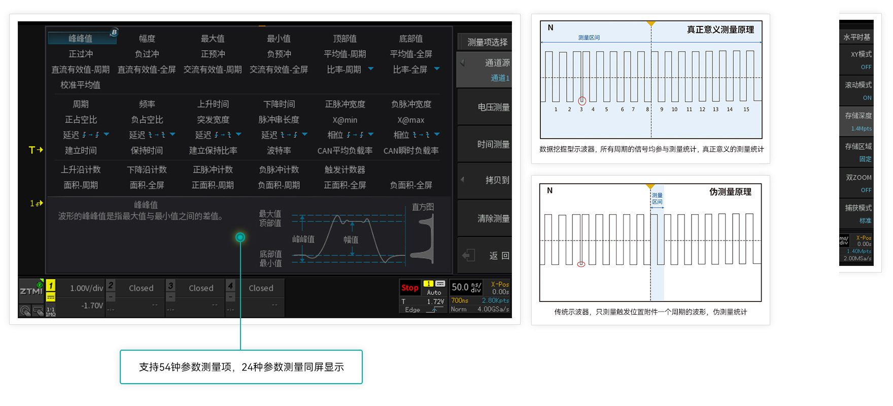 不同于傳統(tǒng)示波器只測一個周期,或通過抽樣減少數(shù)據(jù)量再測量的模式,ZDS4000系列示波器通過FPGA全硬件并行處理,基于原始采樣率和512Mpts全存儲深度,對每一幀波形每一周期進行測量統(tǒng)計,僅需約1秒即可實現(xiàn)對512Mpts數(shù)據(jù)的“真正意義”參數(shù)測量,測試項目可達50余種,并且支持24種參數(shù)同時顯示。這與傳統(tǒng)意義示波器的測量有著本質(zhì)的區(qū)別,也是示波器測試手段與測試方法的突破。
