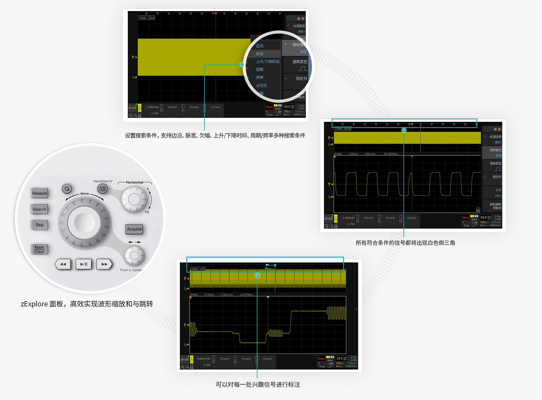 ZDS4000系列示波器不只提供了512M的波形大數(shù)據(jù),還配有強大的波形搜索功能和智能標注功能。您可以先通過邊沿、脈寬、欠幅、上升/下降時間、周期/頻率等多種搜索條件來定位512Mpts波形數(shù)據(jù)中的異常點,再對找出的異常信號使用標注功能,對異常信號進行標注。這里,所有的測量都是經(jīng)過FPGA全硬件加速,整個過程1S左右即可完成。再對找出的異常信號使用標注功能,對異常信號進行標注。