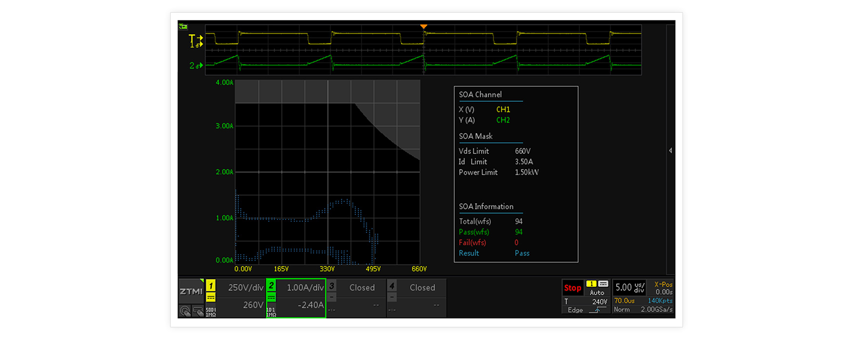功率MOSFET瞬時電壓、電流、功率超出安全工作區,會導致器件損壞、爆炸的風險陡增,常規調試手段難以對器件的各種工況進行全面評估。SOA 安全工作區分析功能,可統計MOSFET在所有工況下瞬時參數超出安全工作區的概率,便于工程師更好的評估電源工作穩定性。