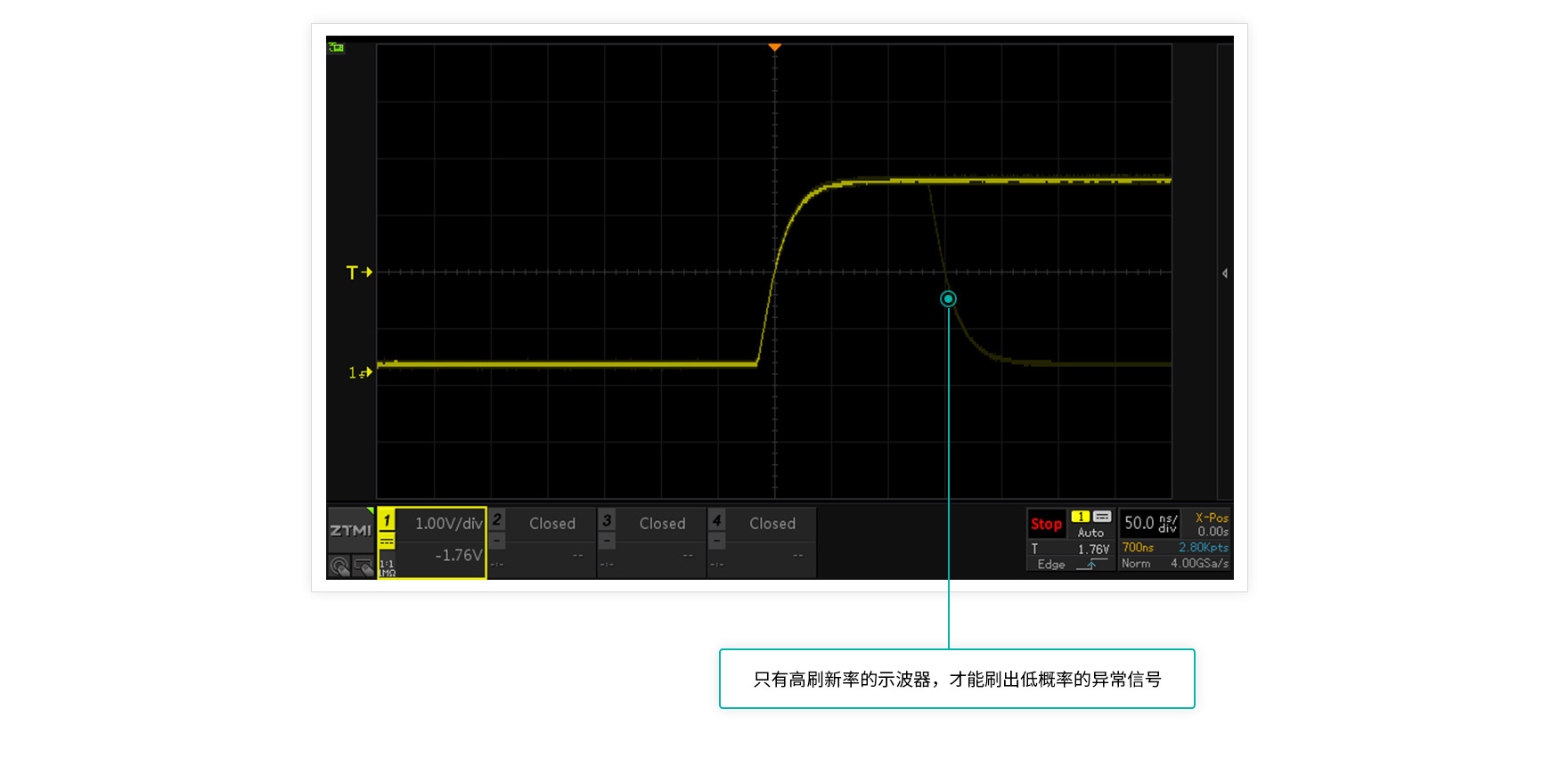 示波器波形刷新率越高,死區時間就越短,可以更快發現偶發性的異常信號。ZDS5054Pro示波器突破100萬次/秒波形刷新率,讓工程師快速發現異常信號。