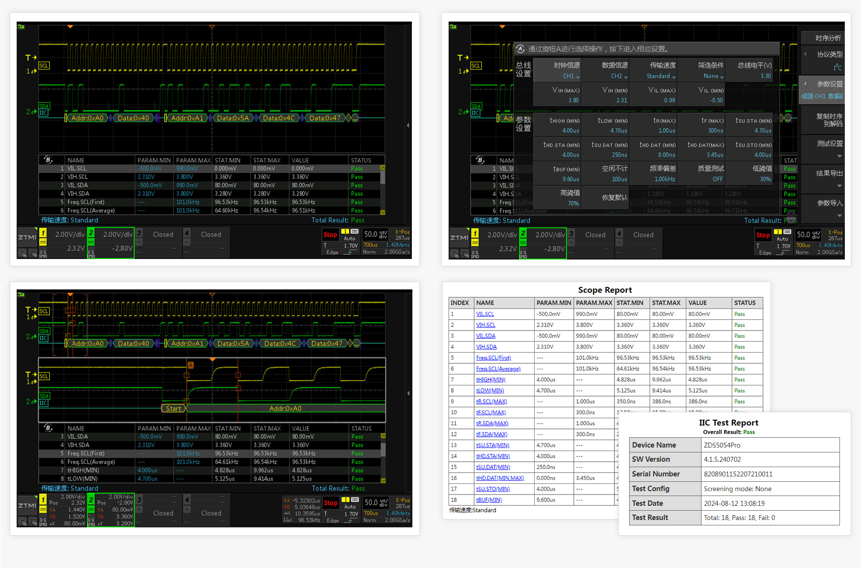 手機、智能穿戴、家電、智慧屏、多媒體影音等嵌入式智能設備,對于內部總線通信時序一致性有嚴格要求。ZDS5054D創新的時序分析功能,可分析IIC、IIS、SPI、MIPI-RFFE等信號的脈寬、幅值、邊沿、建立時間、保持時間等多種組合參數,原本手動測試需要幾十分鐘,使用時序分析功能自動測試僅需一秒鐘即可完成,并可導出測試報告。