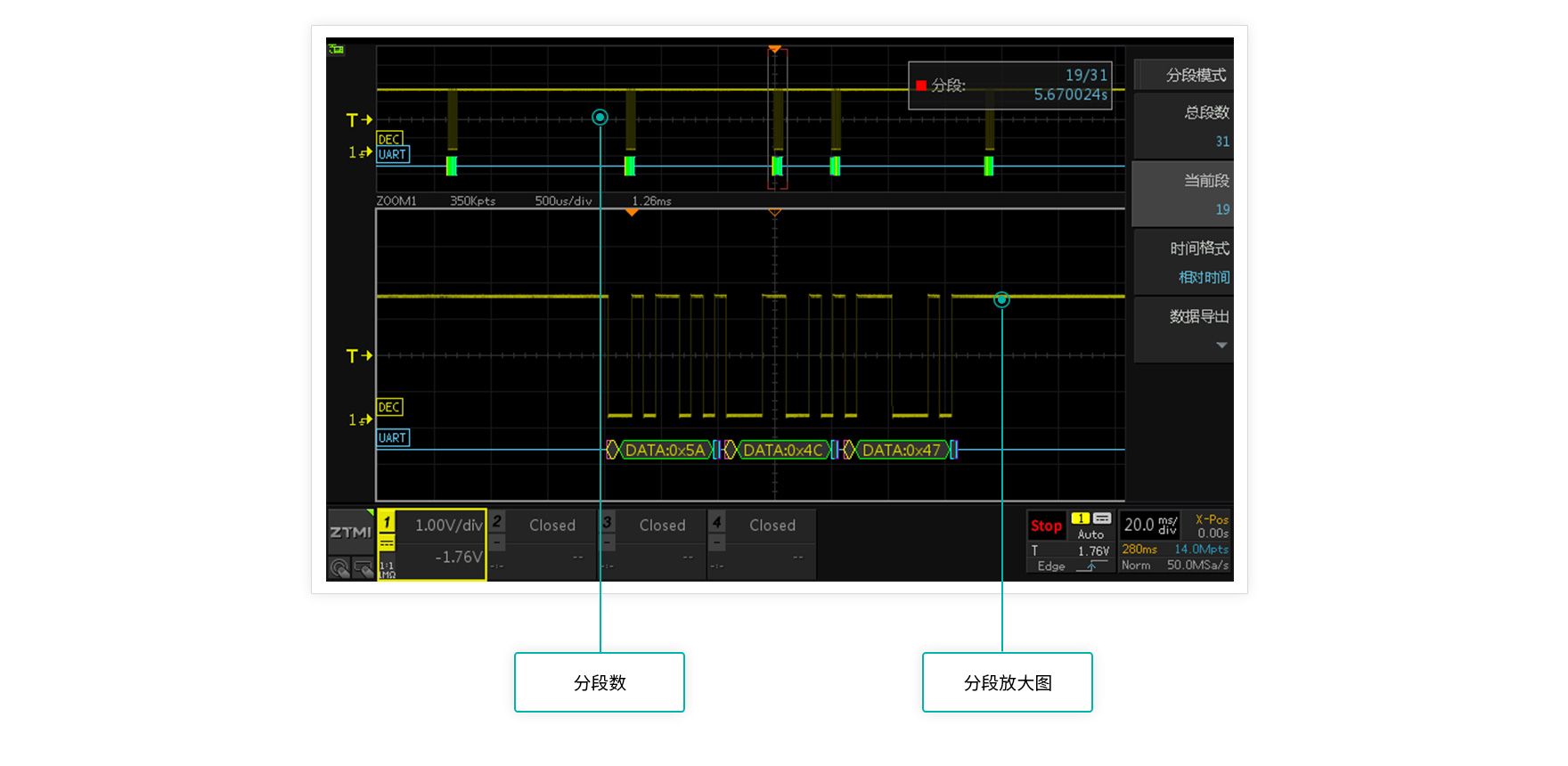 對于偶發信號的波形統計分析,過去需要工程師蹲守在示波器前進行手動測試。分段存儲功能可對觸發的特定波形進行存儲、回放,波形幀數最高可達52萬幀,徹底解放工程師的工作。