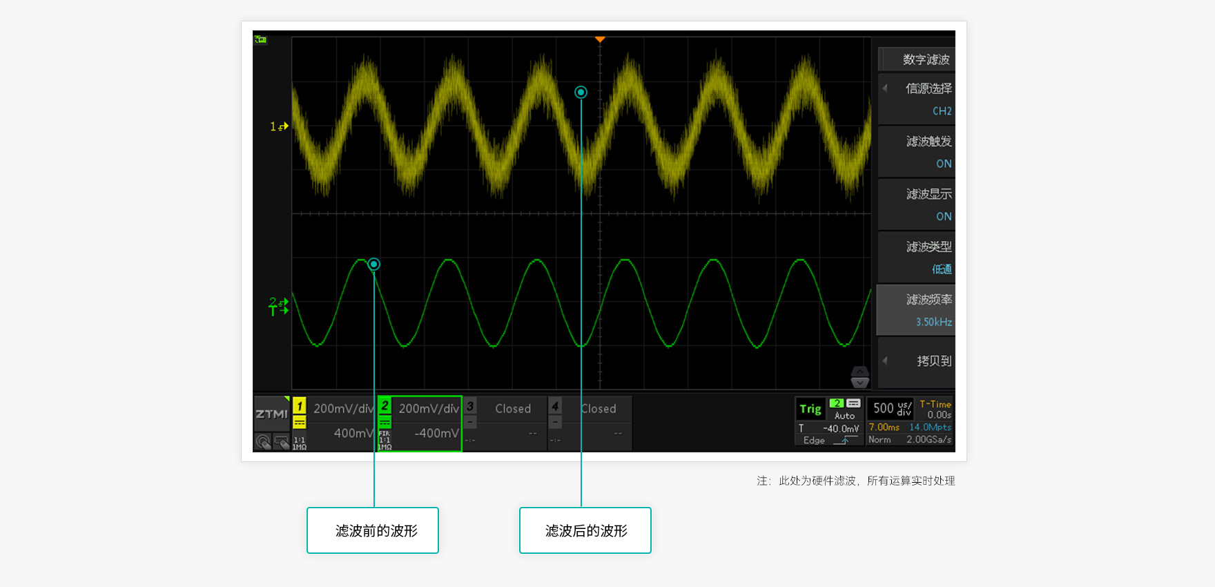 ZDS5000示波器內置FIR硬件實時濾波器,可在10Hz-200MHz范圍內任意調節示波器帶寬,精準過濾特定頻點的噪聲與干擾信號,只呈現有效信號。