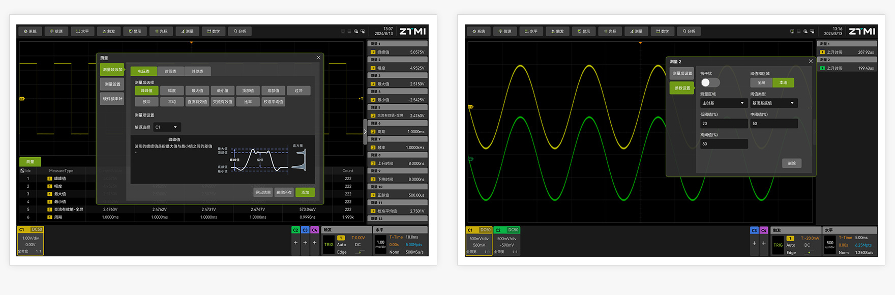 在之前的示波器產(chǎn)品中,所有的測量參數(shù)使用的是同一閾值設(shè)置,如果要測試兩個不同高度的上升時間,就需要將示波器暫停,通過修改配置做兩次測量。ZUS6000可針對測量參數(shù)做獨立的閾值設(shè)置,實現(xiàn)針對同一信號、在同一時刻,顯示不同的測量結(jié)果。