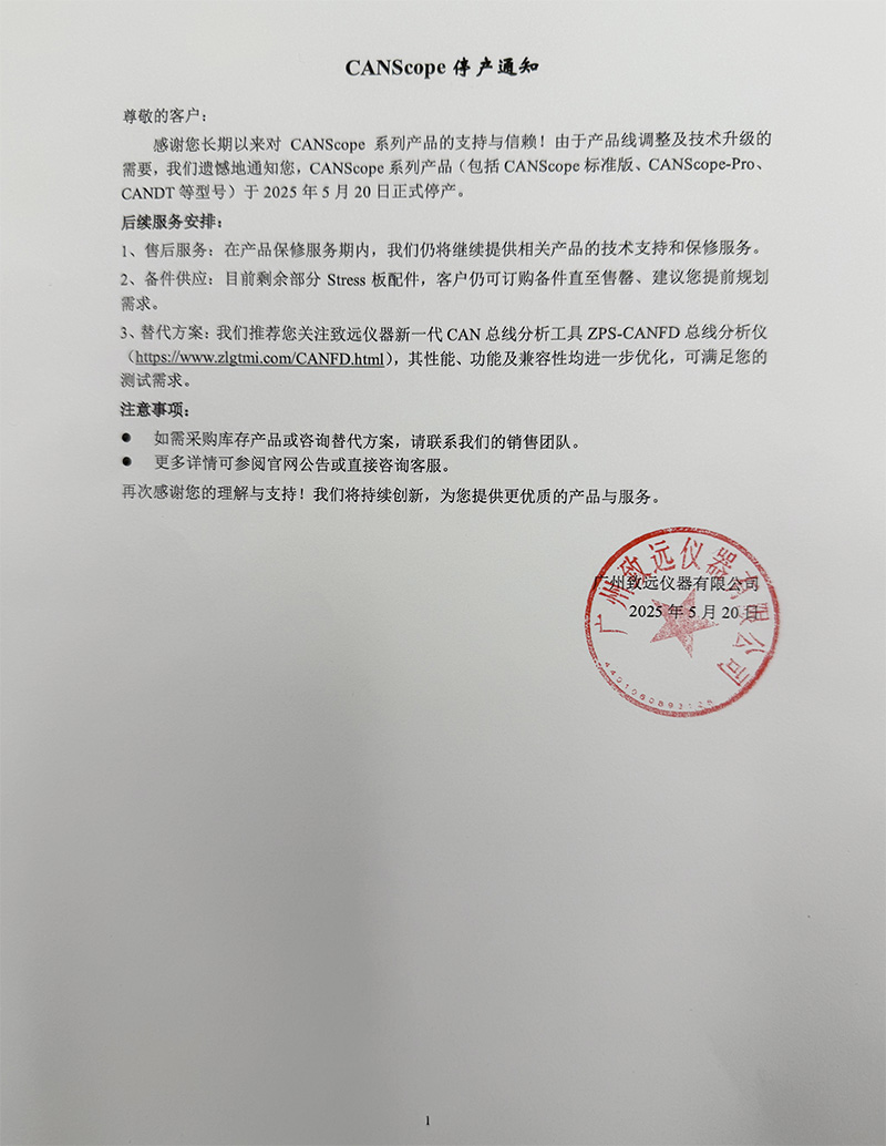 感謝您長期以來對CANScope系列產品的支持與信賴!由于產品線調整及技術升級的需要,我們遺憾地通知您,CANScope系列產品(包括CANScope標準版、CANScope-Pro、 CANDT等型號)于2025年5月20日正式停產。