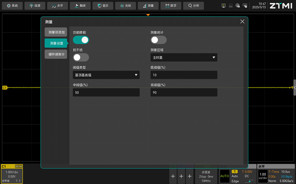 在致遠儀器的示波器中,低閾值、中閾值、高閾值分別默認為10%、50%、90%,如圖1所示為ZUS5054Pro的閾值設置界面。需要注意的是,由于趨勢圖與參數測量和波形搜索三者的測量項的閾值共用一個,改變任何一處的閾值,其他均會跟著改變。