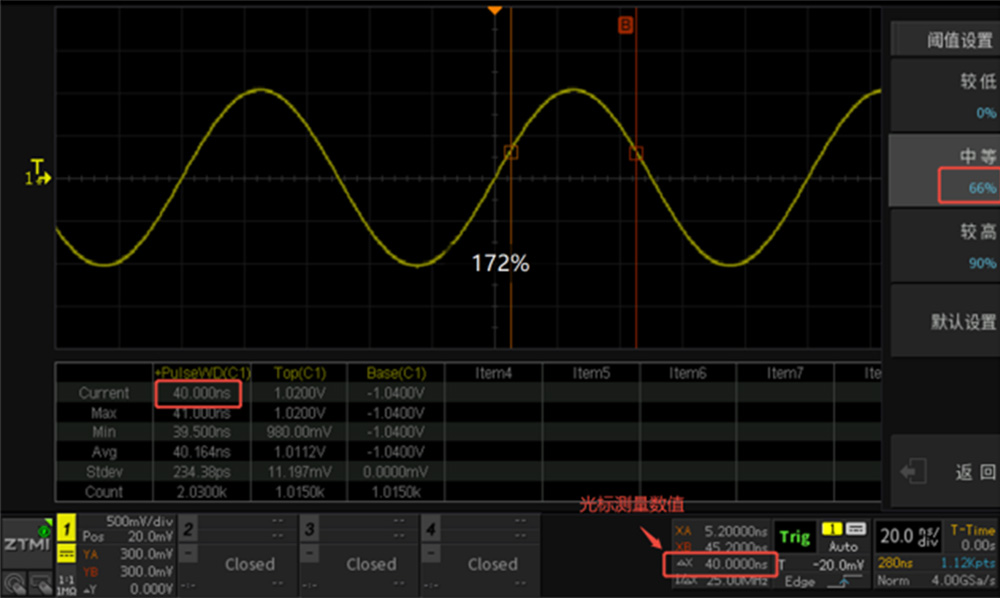 在測量脈寬等時間參數時,用戶可在閾值設置菜單中配置低閾值、中閾值、高閾值三個參數,這些閾值共同決定正脈寬、負脈寬等時間參數的測量結果,進而影響占空比和頻率的計算。