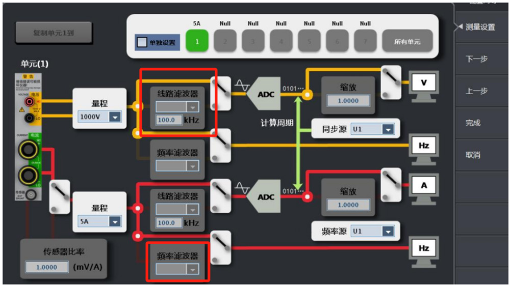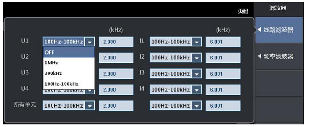 線路濾波器屬于低通濾波器,會去除信號的高頻成分(高頻諧波成分),僅測量低頻成分。需注意:開啟后會導致電壓RMS、電流RMS、有功功率P等測量值發生變化,非必要情況不建議開啟。