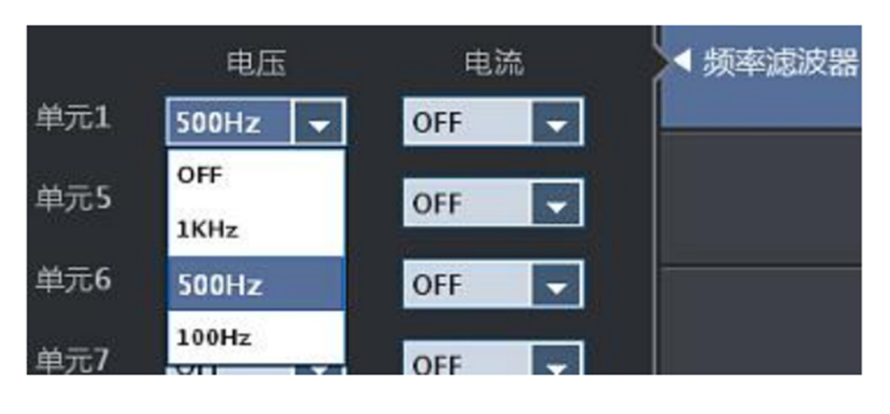 PA5000H支持100Hz、500Hz、1kHz、45~65Hz(IEC諧波模式使用)的頻率濾波器。頻率濾波器可被用于精確檢測過零點,當輸入信號頻率在1kHz以下時,建議開啟頻率濾波器,獲得更準確的過零點檢測。