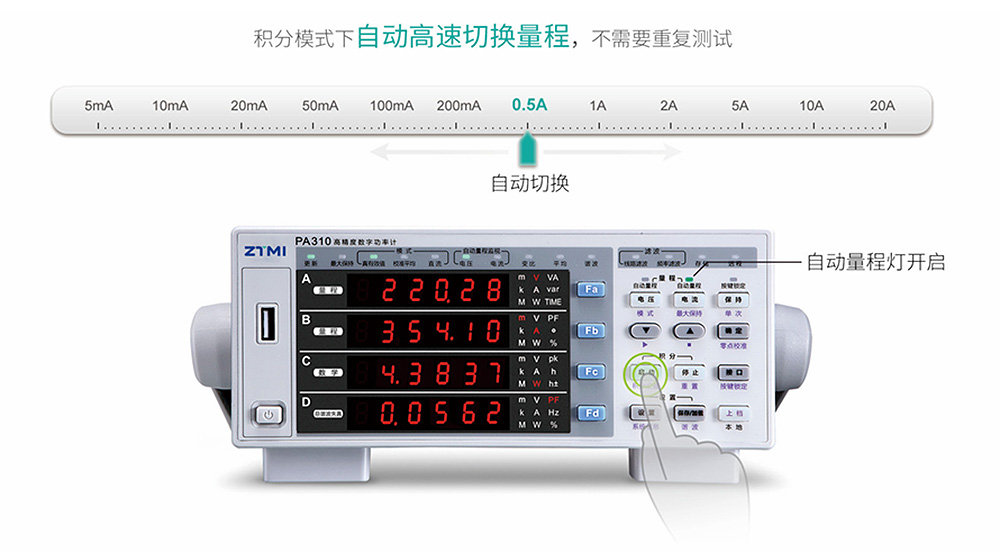 高速自動量程:在負載動態(tài)變化的測試過程中,PA310的積分模式可以實現(xiàn)高速、無縫的量程切換,確保采集到的功率數(shù)據(jù)是連續(xù)、完整的。