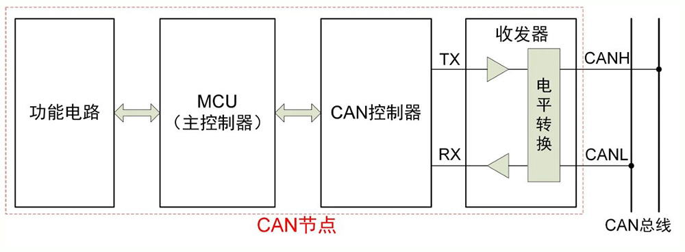 CAN收發器工作于物理層,其功能完全由硬件實現,其作用是將CAN控制器的邏輯電平轉化為CAN總線的模擬差分信號,以及把總線模擬差分信號轉換成CAN控制器的邏輯電平。