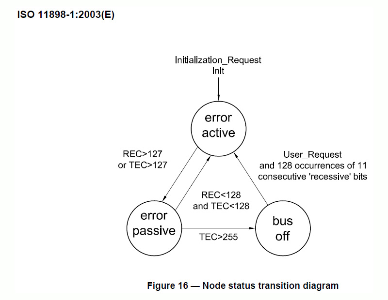 1、由于篇幅有限,關于錯誤計數的詳細規則、節點狀態轉換以及錯誤幀格式等細節均不在本文進行討論,請讀者查閱CAN協議規范。