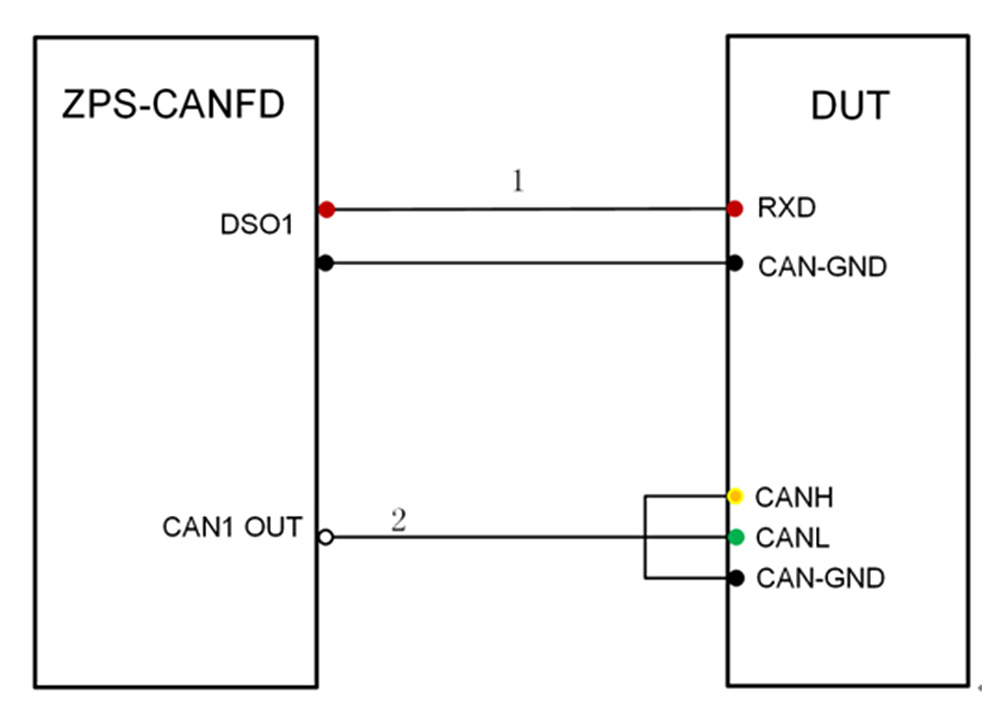 連接設(shè)備:按照?qǐng)D3所示,連接CANH、CANL、CAN-GND,并將ZPS-CANFD的DSO口DUT的RX和地線相連(如果DUT無(wú)法引出RX可以用網(wǎng)絡(luò)采樣點(diǎn)評(píng)估功能)。