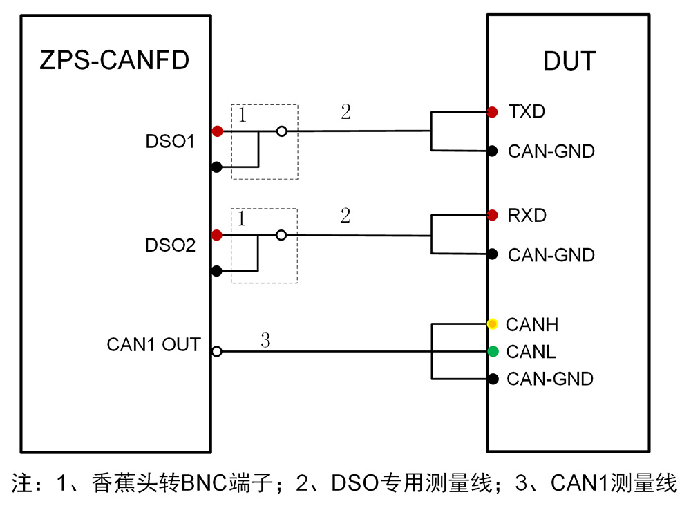 第一步,按照圖2連接方式,將DUT的TXD、RXD、CAN信號分別和ZPS-CANFD的高速模擬通道DSO1、DSO2、CAN1 OUT連接;