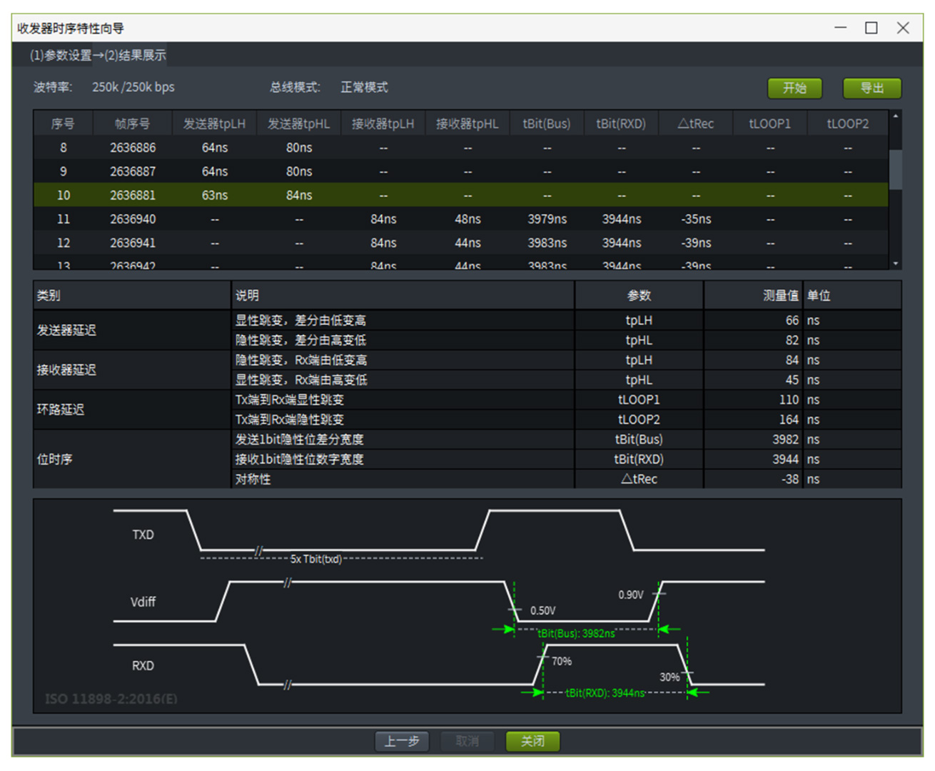 ZPS-CANFD的收發器時序特性測量功能,主要是對CAN收發器的TX到CAN差分,CAN差分到RX通信回路相關延遲時間進行測量,包含的測量項目有:tLOOP、tBit(Bus)、tBit(RXD)、ΔtRec、tPHL_Tx、tPLH_Tx、tPLH_Rx、tPHL_Rx。