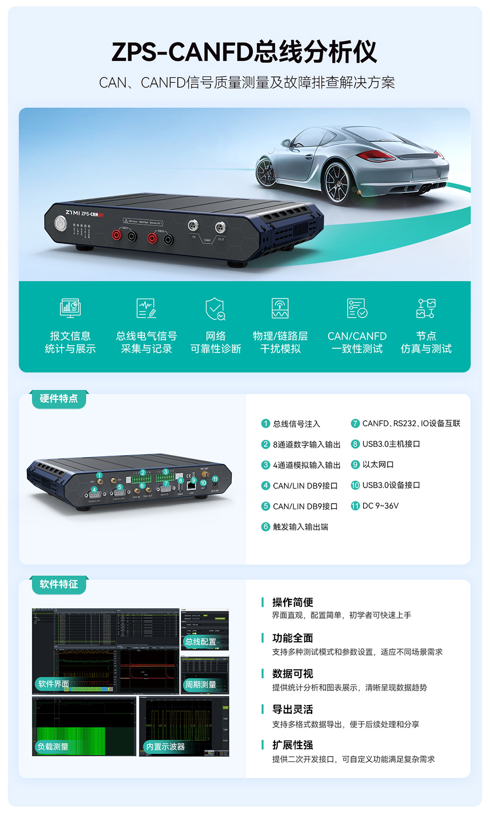ZPS-CANFD是適用于CANFD、CAN、LIN總線的測量測試儀器,支持總線數據的發送和接收,高層協議解析及診斷,能對CANFD、CAN總線物理層電氣信號實時采集和記錄,并附帶有高速模擬通道、通用數字IO及模擬IO,通過提供的硬件接口及軟件功能,用戶能夠便捷地構建總線信號測量與分析、節點功能仿真及測試、網絡可靠性診斷及評估等。