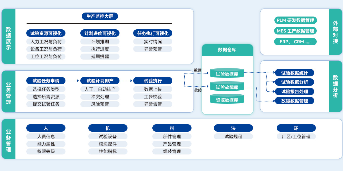 TDM 試驗數據管理系統以“數據”為中心,提供試驗資源管理、試驗業務管理、試驗數據分析與應用、試驗數據展示與外部系統對接五大功能模塊。覆蓋試驗數據收集、管理、 統計與分析全過程,為企業產品生產與質量改進提供堅實的數據基礎。系統支持按需選配功能組件,滿足各類客戶的業務需求。