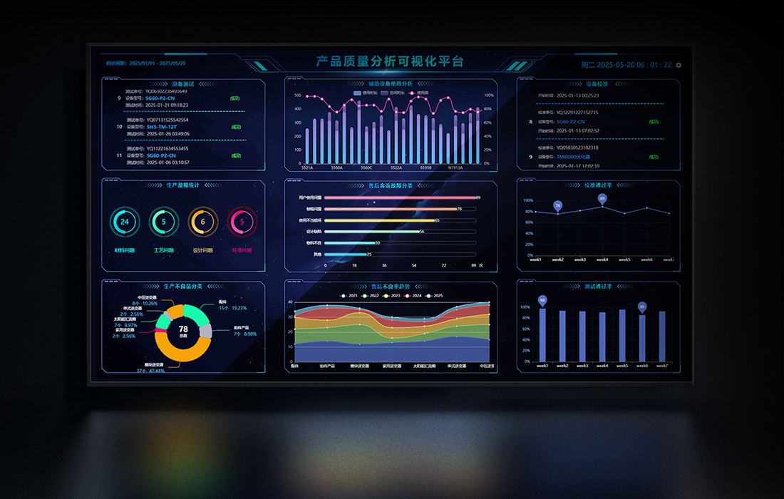 系統提供試驗監控大屏,可以在大屏中監控全部數據信息:進行中任務,任務狀態,試驗資源使用情況,計劃完成度,試驗通過率,不良品分析等。一個大屏掌控全部生產情況。