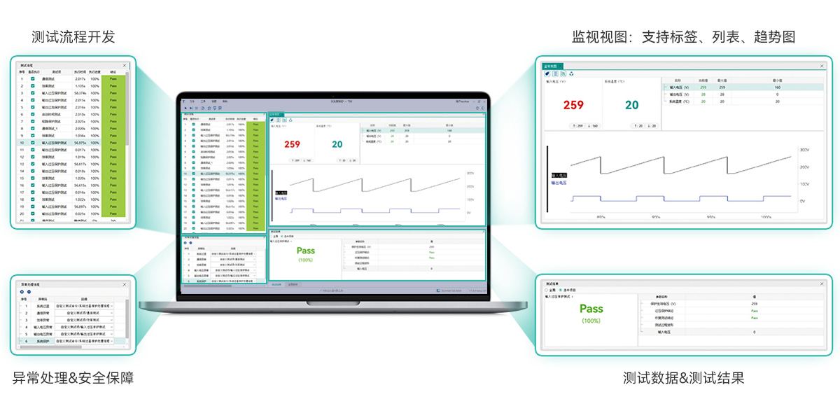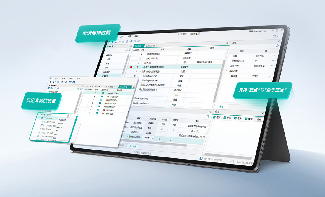 通過輸入參數、輸出參數、全局變量列表,開發人員可靈活在測試項間傳遞數據;支持“斷點”與“單步調試”便于用戶高效定位與解決程序故障。支持查看測試流程的過程數據、日志、變量參數等全方面內容,以確保測試流程的穩定可靠。