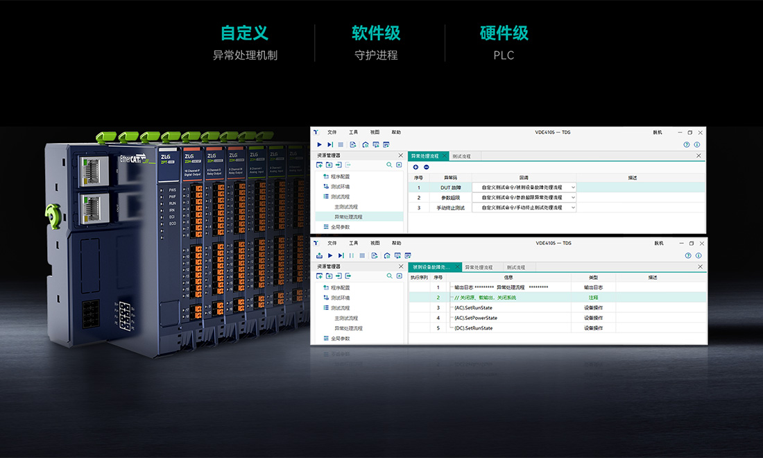 致遠儀器高度重視系統的工作安全性,TDS軟件提供自定義異常處理機制、軟件級守護進程、硬件級 PLC 實時監控模塊,從軟件到硬件,從主動到被動,多層次多維度守護系統軟硬件整體安全。