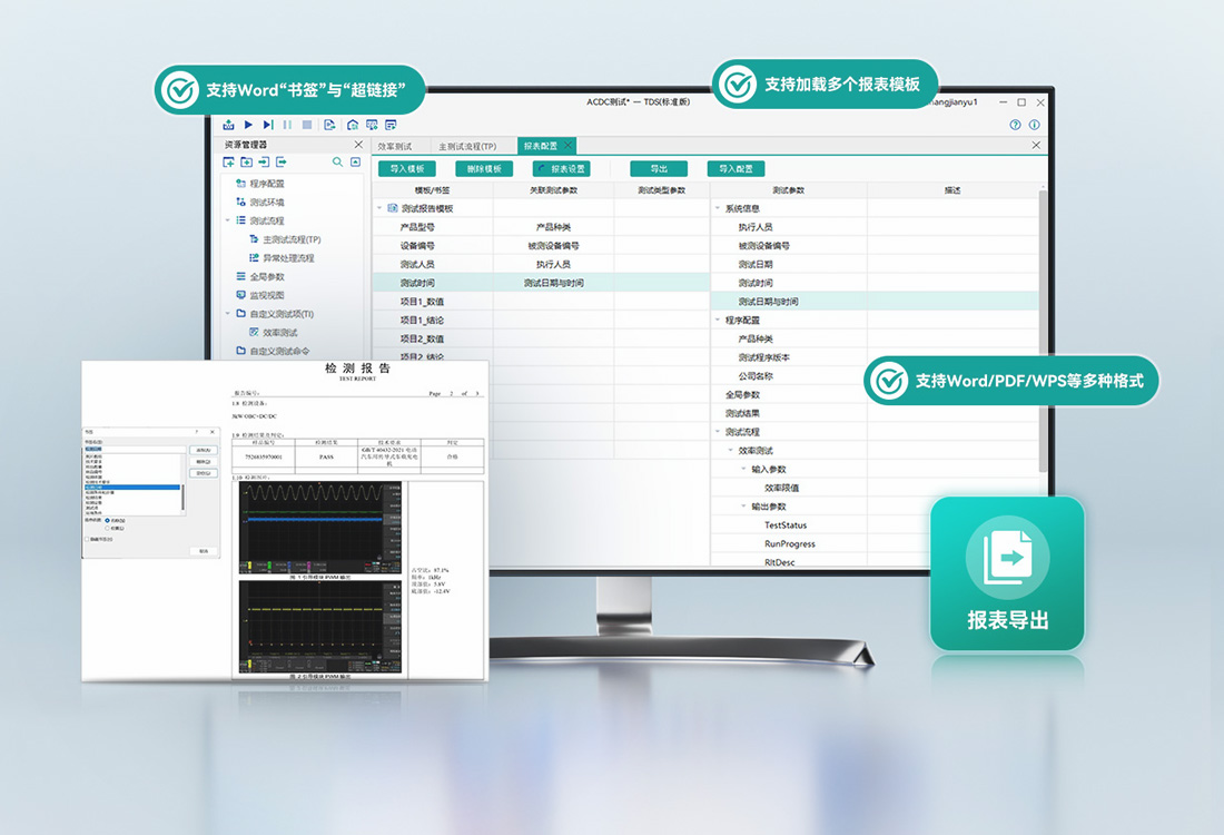 TDS提供強大的報表導出功能,支持Word“書簽”與“超鏈接”兩種方案,以兼顧簡單報表的簡易操作與復雜報表的靈活配置。軟件支持加載多個報表模板,一次測試導出多個文件。并支持WORD、PDF、WPS等多種格式。