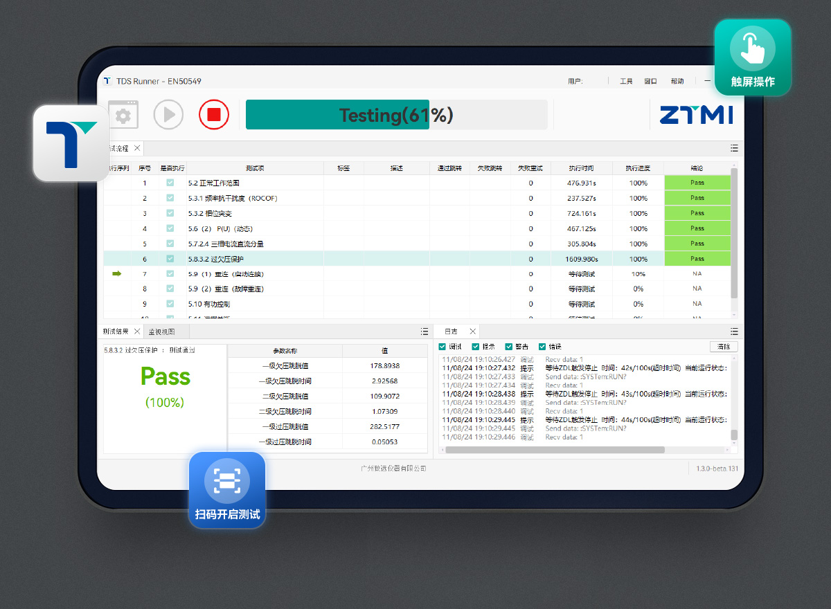 TDS Runner 測試程序執行軟件為測試執行主體,設計了專業的軟件界面與交互方式,支持觸屏操作、掃碼自動開啟測試等定制化功能。為測試執行人員提供了更好的用戶體驗與操作效率。
